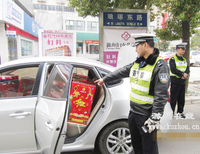 当天早晨7时50分许,正在滁城南谯北路工行路口执勤的交警一大队程鹏警官,突然发现一辆银灰色轿车内携带大量烟花爆竹,遂依法将该车拦停。经进一步检查,民警发现,不仅轿车车身内塞满烟花等危险品,后备箱内也装得满满当当。