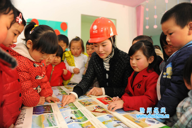 2013年4月1日,滁州市冰心幼儿园的孩子们在听取电力宣传员讲解电力安全标识。当日,滁州市冰心幼儿园联合城郊供电公司开展以“远离电力设施,确保生命安全”的用电知识教育小课堂,电力宣传员为孩子们讲解安全用电常识,提高幼儿们的安全自我保护意识和能力,倡议孩子们争做安全节约科学用电宣传员。