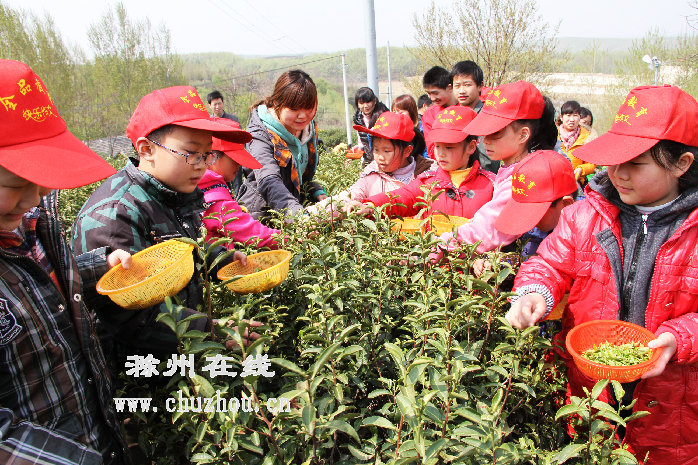 4月6日,来自滁城、全椒、来安等地部分小学、幼儿园等300多名“小天使”到南谯区施集茶场采茶,然后制成“天使茶”拍卖,20家私企等代表参与认购,共得善款52900元,现场捐给滁州市一小身患重病急需救治的单文欣家人。图为孩子们在采摘“爱心茶”。朱永斌摄