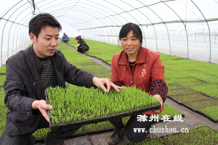 4月18日,农技人员在南谯区乌衣镇育秧工厂里查看秧苗长势,指导育秧生产。该区今年共试点建设三个育秧工厂,每个育秧工厂可覆盖大田机插秧面积2000亩,集中示范面积6000亩,带动全区水稻机插秧面积6万亩以上。该项目的实施,将大大降低劳动强度,亩均减少劳动成本30元,并可增产10%以上,为实现水稻生产全程机械化迈出重要一步。