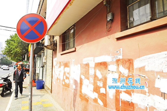 图为定远路路边小广告被涂刷过后留下的白色印子。记者计成军摄