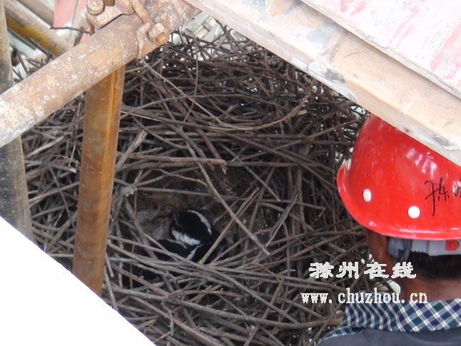 图为“喜鹊宝宝”安全地住在脚手架上的鸟巢里。