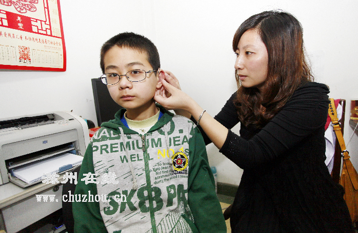 5月7日上午,在省残联康复研究中心,工作人员正在为朱润(左)佩戴一副价值26000余元的丹麦瑞声达助听器。想得到一副助听器是初一学生朱润的心愿,通过“征集微心愿献爱微公益”主题活动,市残联积极联系、申请,朱润终于踏上前往省残联康复研究中心的温暖行程,“小小”心愿得到实现。卢志永摄