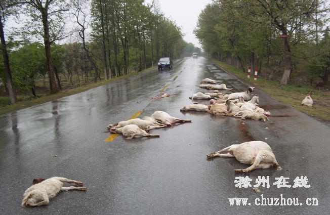 本网讯5月8日下午,来安公路分局来城道班养护人员巡查至省道312下行线74K+50m处时发现,路面上散落着30余只被轧死的羊,旁边还站着一位手足无措的村民。