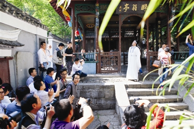 琅琊山管委会联合市网宣办于5月11日下午在醉翁亭景区举办了“关注醉翁亭,爱我滁州”网友见面会,借此加强景区与热心网友面对面沟通与交流,滁州在线等网站召集20多位热心网友热情参与。在活动现场,网友们装扮成欧阳修,在亭中进行饮酒赋诗、朗诵《醉翁亭记》等传统文化,以此呼吁广大市民关注醉翁亭,爱我滁州。