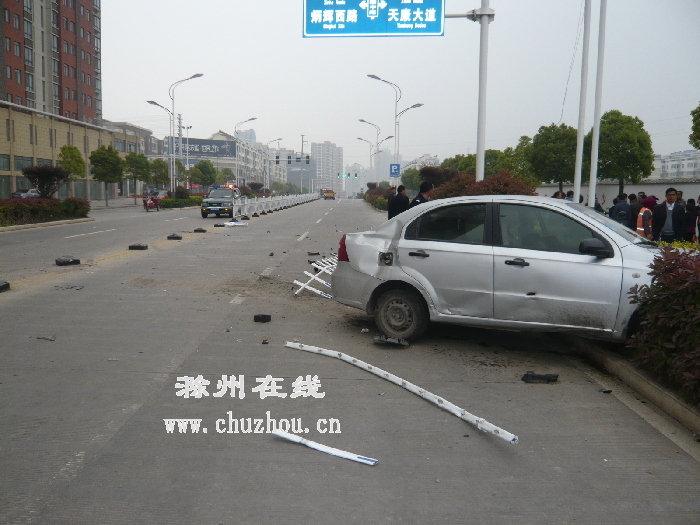 当天下午15时许,一辆“皖MWZ***”银色轿车,沿广陵路由西向东正常行驶。行至当地新城南小学附近公交站台不远处,一辆摩托车突然逆向窜出。轿车司机宗先生急打方向盘转向避让,结果导致轿车冲毁路中央一排隔离护栏,车头撞上对向车道的绿化带中。