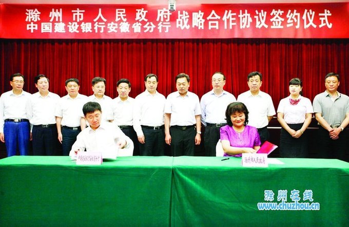 本网讯5月15日上午,市政府与中国建设银行安徽省分行签订战略合作协议。市长张祥安、中国建设银行安徽省分行行长戴跃明出席并分别致辞,副市长孟桂琳主持,并代表市政府与中国建设银行安徽省分行副行长刘兴华签订战略合作协议。根据协议,从2013年起,5年内中国建设银行安徽省分行将向滁州累计投放信贷不低于350亿元。