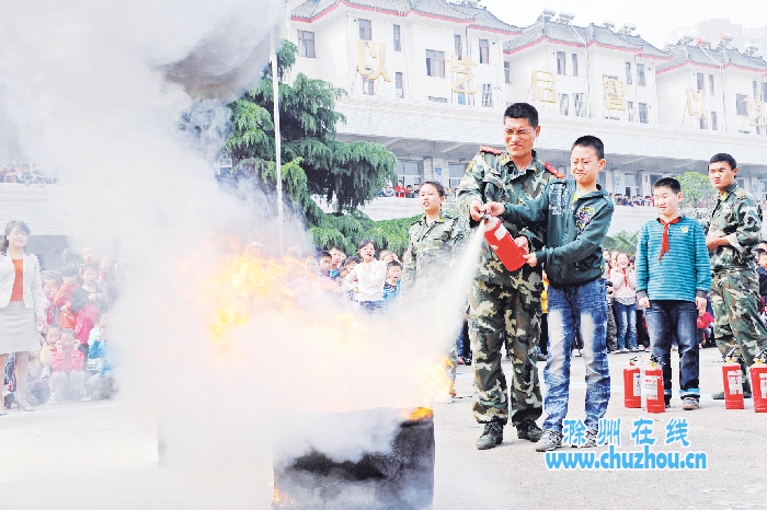 为纪念全国第五个“防灾减灾日”,进一步加强学校消防知识宣传,提升学校突发火灾事故处置工作的应对能力,最大限度地保障师生的生命安全,把事故损失降到最低程度,日前,滁城解放小学携手琅琊消防大队开展消防知识进校园活动。图为消防战士手把手教高年级学生使用灭火器扑灭明火。记者 计成军摄