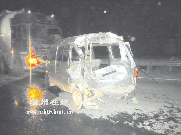 当天晚上22时20分左右,滁宁快速通道南谯区乌衣镇境内3KM+600M处,一辆疾速行驶的大货车,突然追尾前方一辆面包车。因为撞击力巨大,面包车被推行50多米后,又撞倒路边护栏。巨大的反弹力,使得面包车180度大转弯,停下后与大货车头对头。