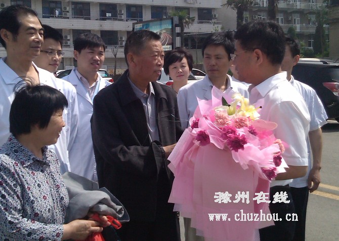 图为市卫生局领导向陈某某(中)献花,并祝他康复出院。