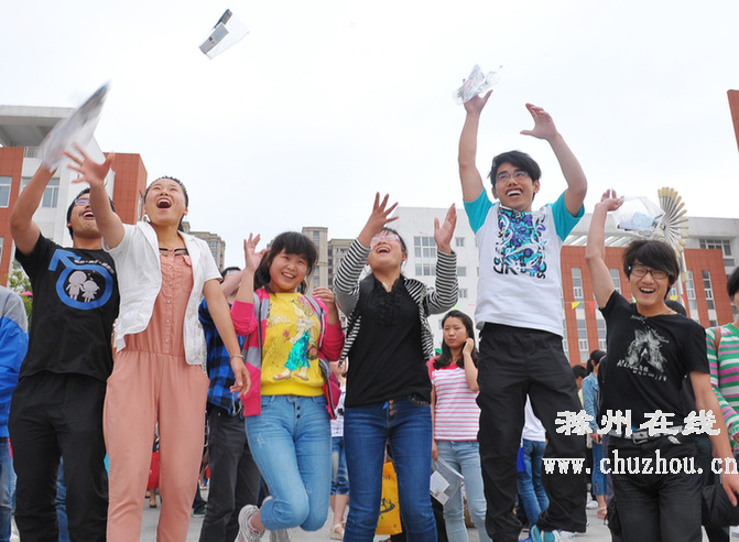 图为考试结束后考生们将考试袋抛向空中释放心情。