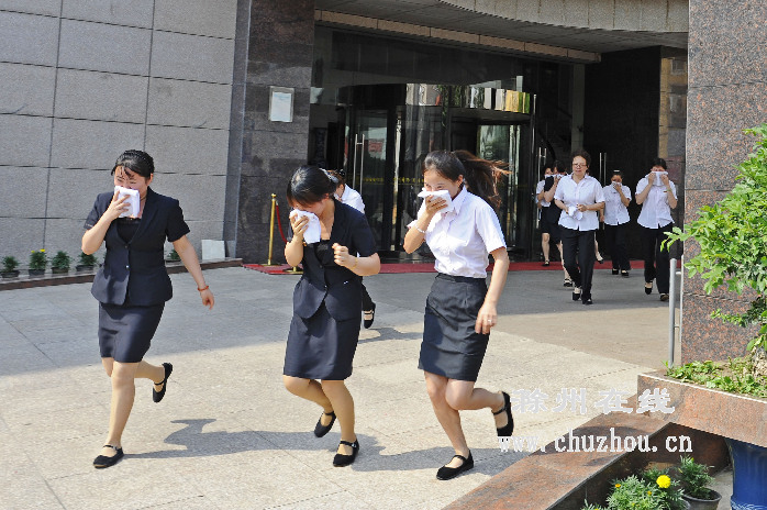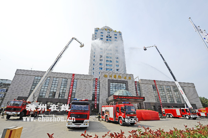 昨日,滁州市消防支队在滁城国际大酒店开展高层建筑应急救援演练,以进一步增强全社会消防安全意识,提升高层建筑消防安全自防自救能力。此次事故演习假定是由酒店10楼一宾客吸烟引起火灾,市消防支队接警后组织灭火救援,利用高喷消防车、登高平台车、救生气垫等专业设备进行灭火救援,最终受困人员被成功解救,“大火”被成功扑灭。参与此次演练的还有医疗卫生、安监、交警等部门。图为灭火救援演练现场。