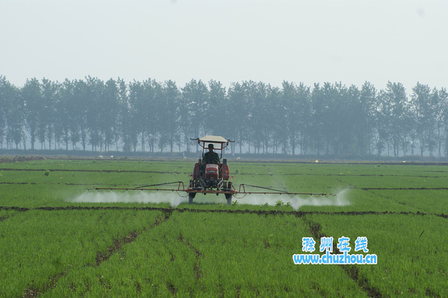 6月17日,在天长大圹圩农场一条已齐苗的旱直播水稻田里,一台机械打药机舒展双翼行走在新绿间,快速均匀地喷吐药剂进行化学除草。当前,正值抢时夏插的关键时期,该场一边抢抓农时,组织机械力量,抢种1.7万余亩机插水稻,一边推广运用大型植保机械,不失时机对早播的2000亩旱直播水稻田进行化学除草和病虫害防治,巩固夏种成果,夯实秋季丰产基础。