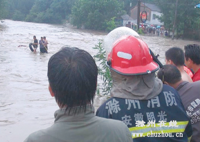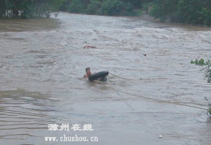 明光消防大队赶到现场时,发现洪水湍急,消防队员已经无法靠近被困货车,只能依靠先前营救男子带过去的绳索展开救援。此时水面继续上涨,已经漫过三人的膝盖,他们随时有被冲走的危险。