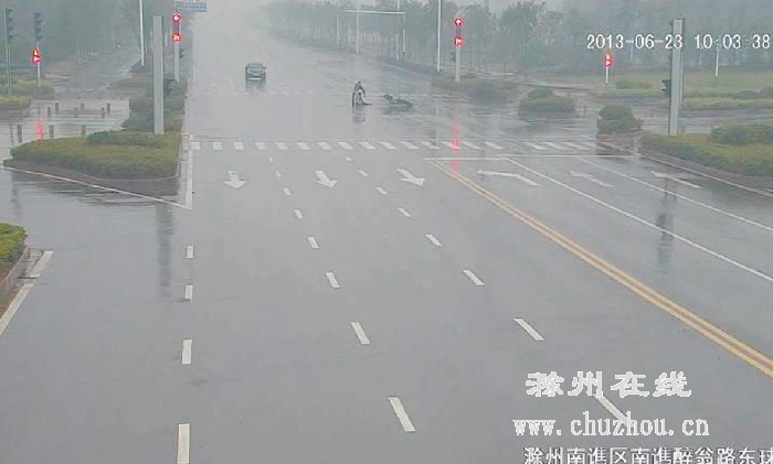 当天上午,滁州境内大雨倾盆。记者从警方提供的视频资料看到,9时56分10秒,滁城南谯路与醉翁路口,一名男子骑摩托车闯红灯试图通过。就在这时,一辆轿车从右侧正常通过,摩托车撞到轿车后,转眼倒地。骑车男子因未戴头盔,伤得不轻,倒在地上不能动弹。