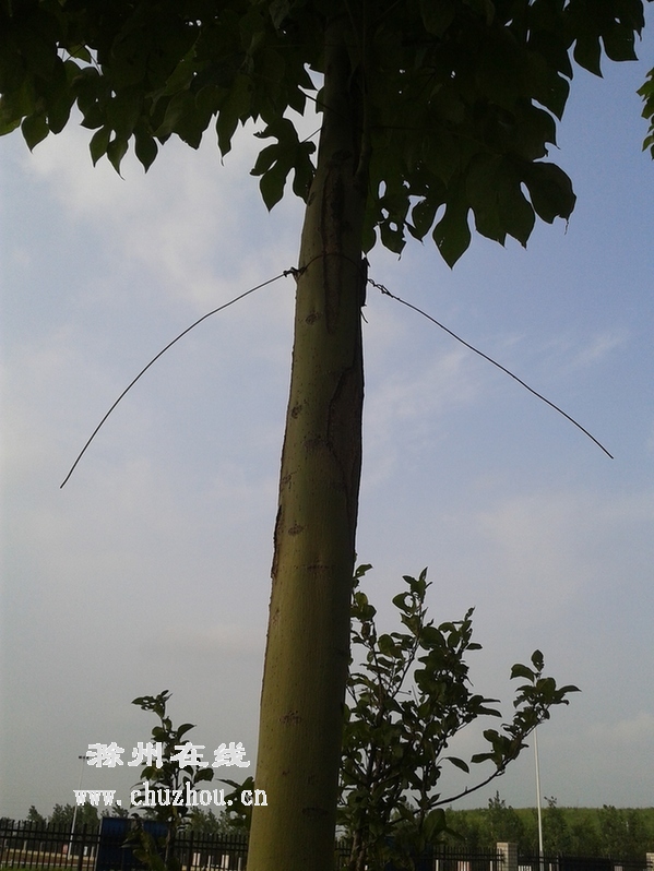 记者王琼核实报道:接报料后,记者来到滁州中学门口看见,两旁的青桐树枝繁叶茂,已经有两三人高,树干下方原本用于固定的支撑,全部被快速长高的青桐挣脱,但其树干的上部却绑着几根铁丝,虽然有的树在绑着的铁丝里面加了一块木块,但铁丝像紧身衣一样,紧勒着枝干。