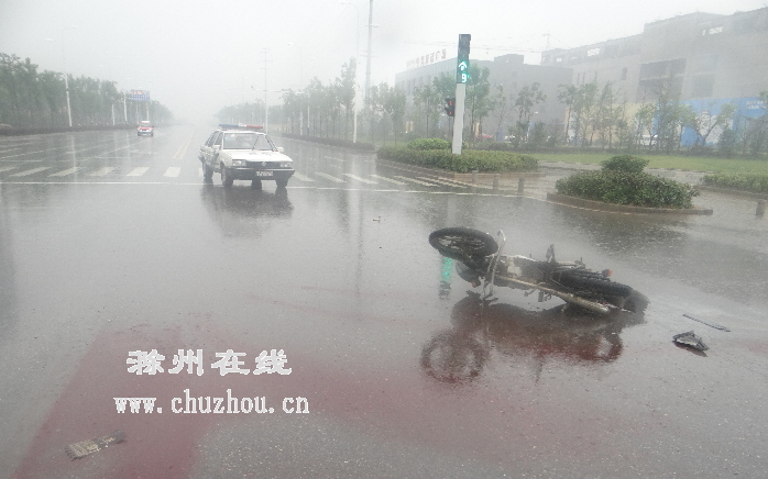 6月9日上午9时30分左右,滁城醉翁路与南谯路路口,一辆摩托车闯红灯撞上一辆轿车。骑车男子未戴安全头盔,身体多处骨折,脑震荡。