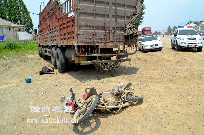 当天上午10时许,明光籍驾驶员季某驾驶一辆“皖M74***”重型仓栅式货车,沿G104线由东向西行驶。行至映山段1000KM+980M处,准备借道超车时,与对面正常行驶的一辆二轮摩托车迎面相撞。瞬间,摩托车连车带人被卷入货车底下,拖行至路边才停下。