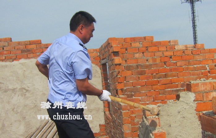 现场执法的城管琅琊分局三大队负责人张队长告诉记者,7月3日上午他们接到市长热线反映后随即赶到现场,发现七、八名工人正在施工。经调查,该户已得到规划部门批复建檐口高为60公分的隔热层,但该户在施工中擅自改变了批建的性质和内容,于是他们当即要求工人停止施工。昨日上午8点多,城管琅琊分局组织城管队员对违建房依法拆除。“下一步,我们将对此处进行监控,一旦发现有违规情况,将再次依法处理。”采访中,张队长表示。