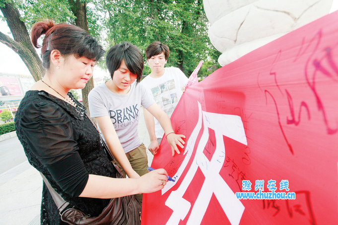 7月8日,在滁城南湖保生桥,过往行人在条幅上签字。滁州学院的大学生们利用暑期开展主题为“低碳中国梦,环保在路上”的社会实践活动。活动将低碳环保与“美丽中国梦”建设理念相结合,通过对市民发放调查问卷、自发签名承诺等形式,宣传倡导低碳环保理念,践行中国梦。