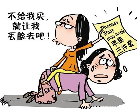 阿花吃了一惊,回家后小心翼翼征求儿子意见:“隔壁姑娘今年也上大学,买的就是个200多的诺基亚手机,我们不买‘苹果5’可成?”小虎一听勃然大怒,嚷嚷道:“人家还买苹果三件套呢!现在没有个好手机,在大学里根本没有面子!”说完,气得跑进山里。