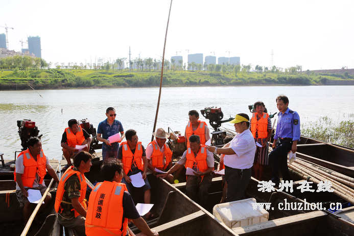 连日来,为排查安全隐患,保障渔业生产安全,南谯区渔政渔港部门安全执法人员冒着高温酷暑对辖区内清流河、滁河、水库等33艘机动和22条非机动渔业船舶的船体质量、主机性能、救生、消防、船号等设施设备进行安全检查,并为每条渔船配发了两套救生衣。图为渔政执法人员在清流河岸向渔民散发宣传单宣传安全知识。