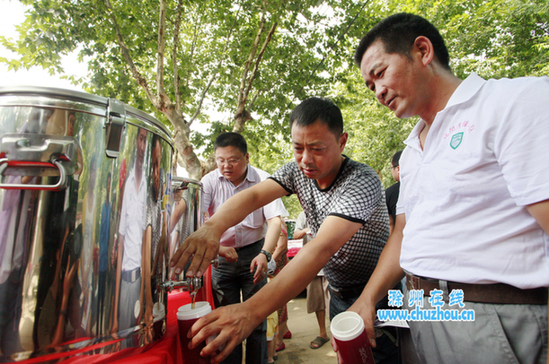 8月6日,由市公路运输管理处主办,1912个爱心计划之要·就要爱TAXI启动仪式在育新东路老地委举行。活动向全市1300辆出租车司机免费赠送爱心饮品杯。的哥的姐们可凭此杯免费无限量畅饮绿豆汤、酸梅汤、柠檬水等消暑解渴饮品,在炎炎夏日里,品尝一份清凉的问候。据悉,此次活动时间持续至9月30日。图为出租车司机们在享用免费饮品。卢志永 摄