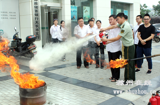 持续的温高,火险火灾隐患增多。为加强辖区企事业单位员工消防安全意识,提高员工的火灾防控能力,天长市消防大队官兵近日到辖区邮政储蓄银行为该单位员工讲解防火、灭火和自救知识,现场模拟演示使用灭火器等。图为消防官兵现场手把手教员工们用灭火器扑灭明火。浦天龙 卢志永摄