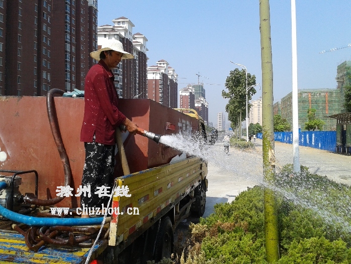 自7月份以来,城区绿化苗木开始出现旱情,园林部门每天上路浇灌的时间已不少于12个小时。8月6日起,绿化旱情加重,园林17辆洒水车除避开中午的高温时段外,每天浇灌的时间已达19个小时,分三个班次连轴转。“早上6点半到中午11点,下午3点到晚上10点半,晚上10点半到次日凌晨5点半,”他说,浇水最好是早上或者晚上,中午不能浇水,因为高温下蒸腾作用会导致树木加速失水,而且浇水最好是一次性浇透。同时,11辆社会养护车辆也开始加入灌溉的行列,16台水泵对车辆进不去的公园、绿地进行抽水浇灌。据统计,每天城区的洒水量达到上万吨,是去年同期的10倍。