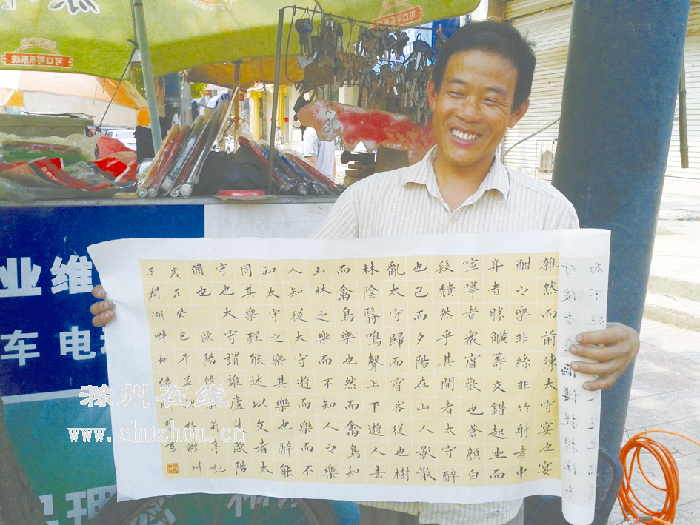 胡师傅今年41岁,老家在定远。初中毕业后,他一直在老家种田,闲暇之余也对着字帖临摹临摹。1996年来到滁城后,他学了修车手艺,就在古马路上摆起了修车摊。每天早晨6点半,胡师傅推着自己的修车摊来到路上摆摊修车,顺带配钥匙。修车的活不像企业的流水线,空闲时间比较多,胡师傅于是重拾少时“旧爱”,从书店里买来了一大堆字帖,开始临摹练字。