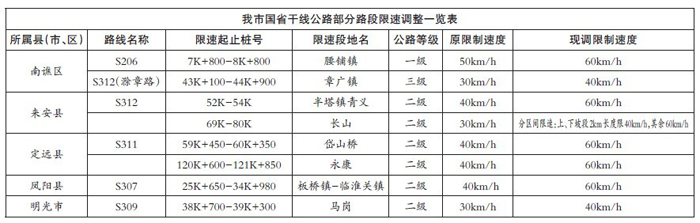 “近年来,伴随着我市公路路域环境的逐步改善和公路交通安全隐患的综合治理,滁州境内许多公路的通行标准都得到大幅提高。”市公路管理局路政科科长赵增林在采访中这样告诉记者,“为进一步规范和完善我市公路限速标志的设置,更好地满足群众便捷高效安全的出行需求,经市交通运输局、市安监局、市公安局批准,我市将调整国省道干线公路部分路段的限速标准。”(记者李志情)