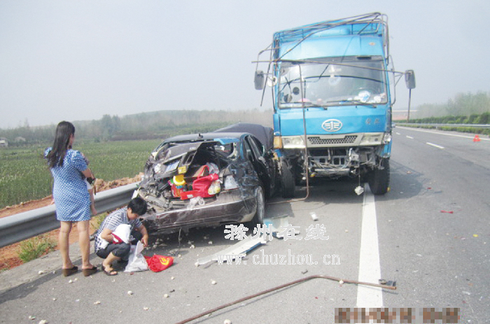 记者从滁州市交警支队高速公路四大队获悉,事发地点位于宁洛高速公路明光市境内,往南京方向133KM处。民警赶到现场,发现不远处一辆红色货车撞坏高速公路中间隔离带停在快车道上,近处一辆蓝色货车将一辆宝马轿车挤压到路边护栏上。两辆货车仅车头轻度受损,但宝马轿车已被撞得面目全非。