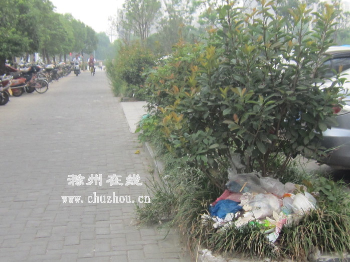 报料内容:21日路过滁城清流路与中都大道交叉口时发现,一段绿化带中被扔了不少垃圾,很是刺眼。