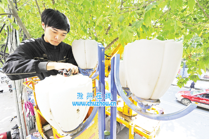 昨日上午,滁城天长西路上,市路灯管理处的工作人员正在对路灯进行维护管理。