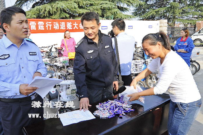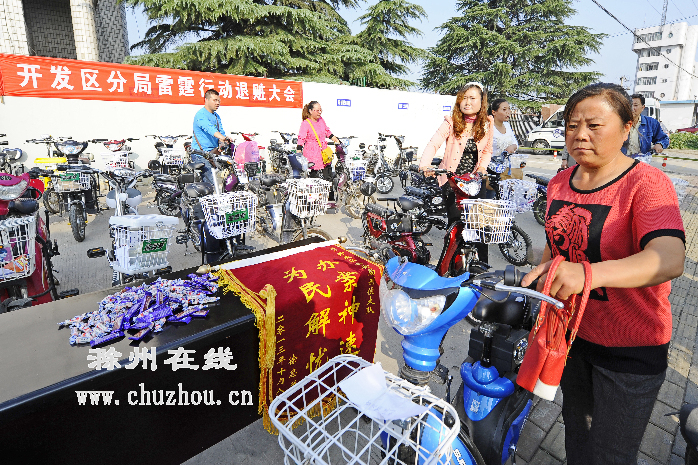核心提示: 滁州:“雷霆行动”追回被盗车辆 10月9日下午,滁州经济技术开发区公安分局门口,20多位摩托车和电动车车主,喜滋滋地从民警手中推走被盗车辆。