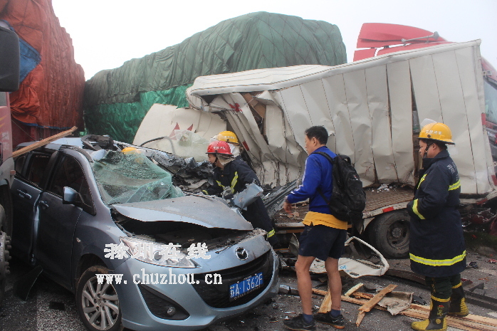 据目击者称,事发时浓雾弥漫,能见度极低。宁洛高速上行线86KM+700M处,有5辆汽车发生追尾。一辆小轿车和一辆货车被夹在中间,车头严重变形。因遭遇重创,两名驾驶员都被死死卡住,伤势严重,如不及时救助,后果不堪设想。