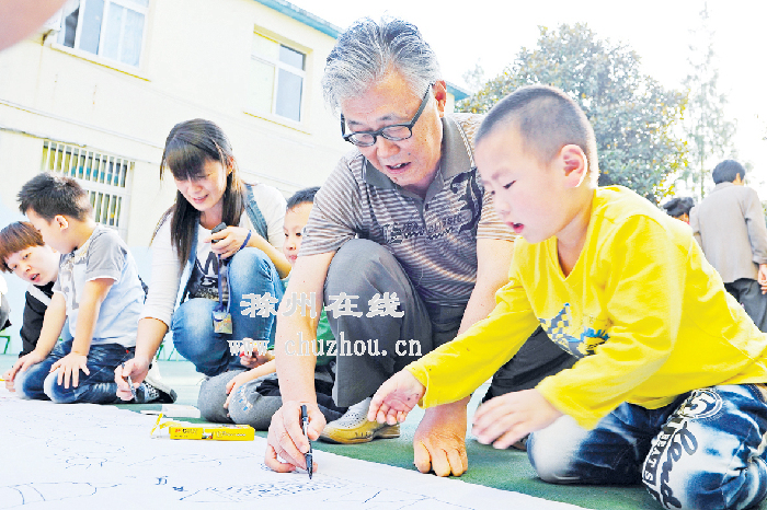 10月12日,滁城市直幼儿园大班的小朋友们和自己的爷爷奶奶、爸爸妈妈同绘一幅长卷,为老人们“过节”。