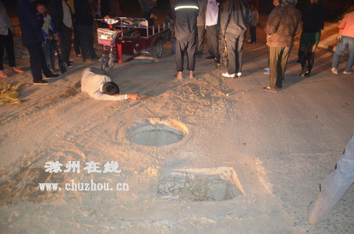 当天晚上20时许,明光市梁郢小区居民胡某,在朋友家吃过晚饭,骑电动三轮车回家。行至小区门前时,借助微弱的灯光,胡某发现道路上有险情。原来,前方一处窨井没有盖子,路面上露出一个黑洞。于是,他紧急打方向避让,以为可以化解,谁知意想不到的事情再次发生。胡某刚绕过一个窨井,前方又出现一个没盖的窨井,三轮车右后轮掉进洞里,胡某从车上被甩了出去,一头摔倒在地,卧地呻吟不止。
