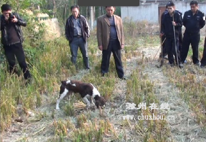 当日,凤阳县一只警犬和省刑侦总队4只搜索犬相继赶到。在它们的帮助下,警方很快在刘某某承包田里,发现一件血衣和鞋子,村民指认为刘某某所有;在刘某某门前水沟里,民警起获一把菜刀,疑为作案凶器。