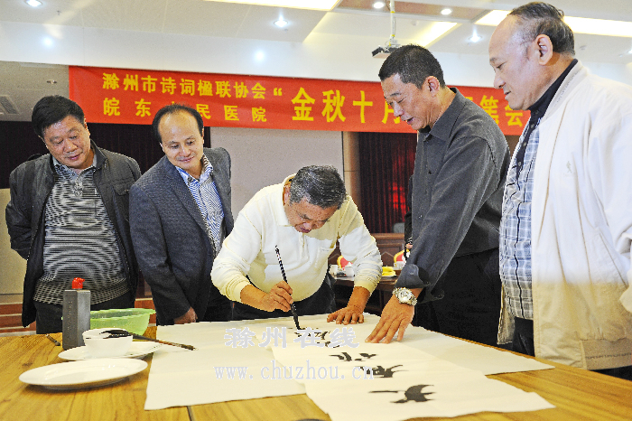 10月26日,市诗词楹联协会在滁城某医院举行“金秋十月”书画笔会。滁城、来安、全椒近二十位书画家齐聚一堂,挥毫泼墨,草书,行书,行笔潇洒,山水,花鸟,设色典雅,幅幅堪称精品。当天,书画家们共创作书法,绘画作品近50幅。图为书画家们正在创作。记者 计成军摄
