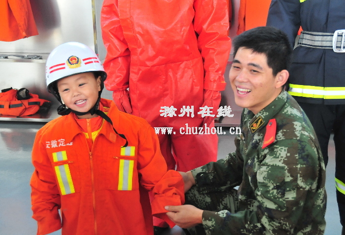 11月8日,定远县示范幼儿园的小朋友来到定远县公安消防大队,学习消防知识,感受军营生活。当天,县消防大队的官兵们带领孩子们参观了部队的营区,为孩子们讲解消防器材的用途和使用方法,传授消防知识,教给孩子火场逃生的方法,官兵们还为孩子们穿上消防服装,让孩子体验当消防员的快乐。