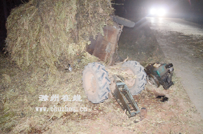 当天傍晚17时许,江苏籍驾驶员陈某,驾驶一辆牌照为“苏NE2***”的大货车,前往明光市潘村镇拉货。途经紫阳村境内时,遇到前方同向一辆缓慢行驶的拖拉机,上面堆满花生秆。陈某随即鸣笛,并加速超车。不料在超车过程中,因拖拉机超宽,陈某采取措施不当,致使两车发生激烈碰撞。在惯性作用下,拖拉机从公路上一头扎向路边,翻倒在路基上,车头和车身分了家。