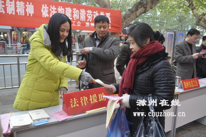 在全国“12·4”法制宣传日到来之际,市司法局、市总工会组织单位工作人员和志愿律师,在滁城天长东路闹市区繁华地段开展以“大力弘扬社会主义法治精神,依法构建和谐劳动关系”为主题的职工权益维护法制宣传、法律援助等内容的便民服务宣传咨询活动。向过往市民宣传“六五”普法知识、工会法律制度,为市民提供法律咨询及便民常识服务,活动中散发各类法制宣传资料2000余份,开展职工群众法律咨询和服务150多人次。