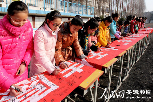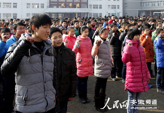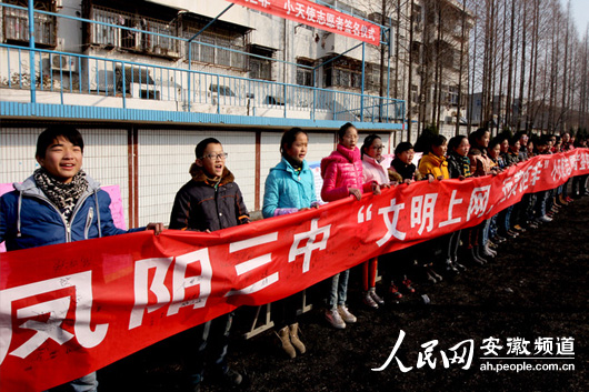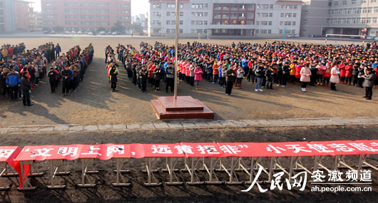 人民网讯 1月10日上午,为响应安徽省网宣办、省文明办“坚守七条底线·共建网络文明”的文明上网倡议,教育引导青少年自觉抵制黄色书报刊、黄色音像制品和非法出版盗版书籍,由滁州市凤阳县委宣传部、县政法委牵头,县扫黄办、网宣办、团县委、县妇联、县教育局、县文广新局、县公安局联合举办的“文明上网 远黄拒非”小天使志愿者签名仪式在凤阳县三中操场隆重举行,来自主办、协办单位的负责人和凤阳三中的3000余名师生参与了此次签名活动。