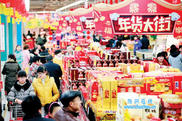 1月22日,滁城某超市内,市民们在忙着购买年货。随着春节的日益临近,年味也越来越浓,滁城的各大商场、超市、农贸市场内大红灯笼高高挂,各类年货琳琅满目,前来购买年货的市民络绎不绝,好一幅欢欢喜喜过大年的祥和场景。记者卢志永摄