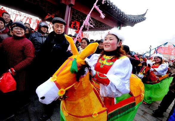 2月15日,安徽全椒民间花灯队在“走太平”活动中表演“划旱船”。新华社发(王家国 摄)