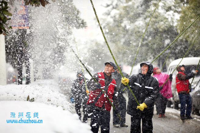 2 月18 日,市园林局工人们对南谯路、琅琊路、丰乐路等路段的行道树进行积雪清除。记者卢志永摄