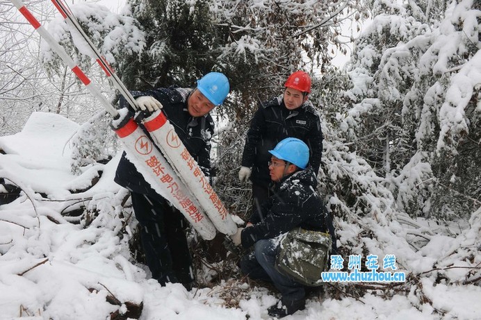 2 月18 日,市供电公司抢修队员冒着风雪在南谯区李冲村抢修供电设施。特约摄影宋卫星通讯员王尚章