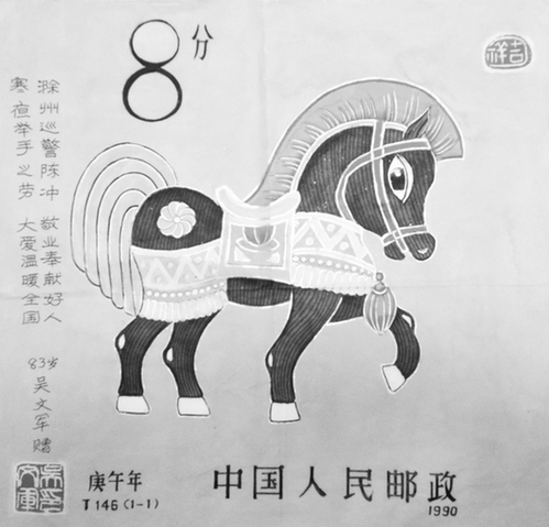 2月21日,《皖东晨刊》《快去投票,顶咱老乡当“中国好人”》一文报道了我市最美交警“托举哥”陈冲和冰河救人的好老师葛宗保的事迹。而在看到这篇报道后,凤阳县83岁老人吴文军的心久久不能平静,感动于陈冲和葛宗保的美德,老人辗转一夜,连夜仿制了两幅马年邮票,并特意写了信件寄来报社,委托本刊一定要将作品转达至两位好人手中,向他们表达问候与敬意。