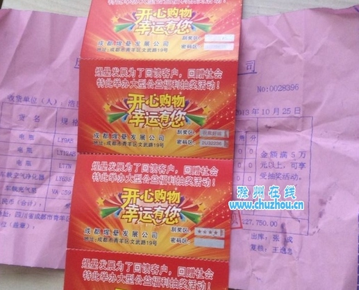 当天中午,何先生在全椒乘坐公交,下车时看见了一个塑料包,于是捡起来打开查看,发现里面有4张成都曐煋公司发售的购物彩票,还有一张购物清单。“单子上说是购物满5万赠送一张彩票,购物额度是20多万,所以有4张彩票。我想,这是哪个不小心掉的,于是开始刮奖,前三个都是谢谢惠顾,我当时很淡定,因为觉得这种好事不会摊到我身上,可是刮到第四张时竟然有4颗心!二等奖是24万元支票!”
